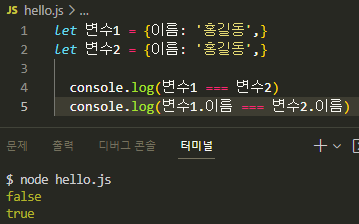 그러니까 객체를 하나 만들면 메모리에 어떤 값을 저장하는데 객체는 그걸 찾을 수 있는 어떤 값(주소같은...)을 가진다는 뜻이고, 결국 같은 내용을 두 객체에 저장한다고해도 두 객체의 값인 주소는 다르다고 이해했다.