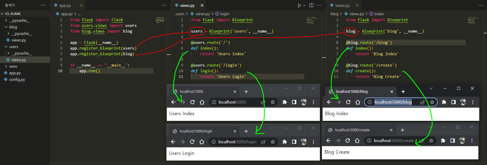 위 코드에서는 users.views와 blog.views 모듈에서 정의한 users와 blog 블루프린트를 app.register_blueprint() 메소드를 사용하여 등록했다.