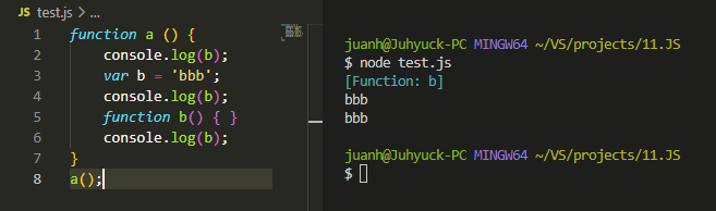 위의 함수를 생각해보면, 처음 console.log(b)를 실행하면 b가 정의되지 않았으니, undefined가 출력이 되고, 그다음 b를 'bbb'로 정의하고 난 console.log(b)는 'bbb'를, 마지막의 함수 b를 정의한 다음 console.log(b)를 다시 실행하고, 끝나는 형태로 읽히기 때문에, b가 정의되지 않아서 에러 ReferenceError 가 나올 것 같지만, 실제로는... 아래와 같이 undefined가 아니라 [Function: b]가 출력되는 것을 확인할 수 있다.