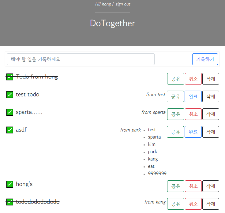 구현한 웹페이지는 DoTogether로 작명하고, ① 다른 사용자에게 내 ToDo를 공유하는 기능, ② 완료/취소 표시 기능, ③ ToDo를 삭제하는 기능을 구현했고, ④JWT를 쿠키에 저장해서 로그인 유지와 로그아웃 기능을 구현했다.