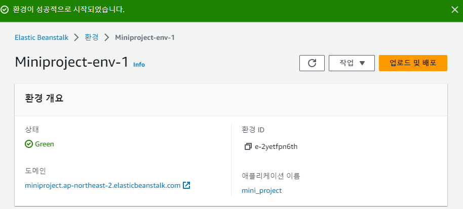 이제 환경 시작한다고 배너가 뜨고, 조금 기다리면... 위쪽이 초록색으로, 업로드 및 배포 버튼이 오랜지색으로 바뀐다.