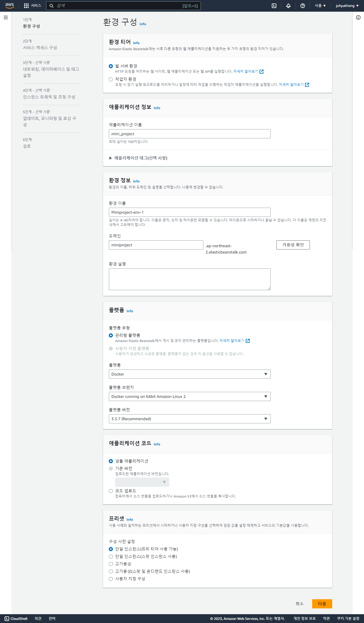 플랫폼은 Docker로, 플랫폼 브랜치는 Docker running on 64bit Amazon Linux 2로 선택했다.