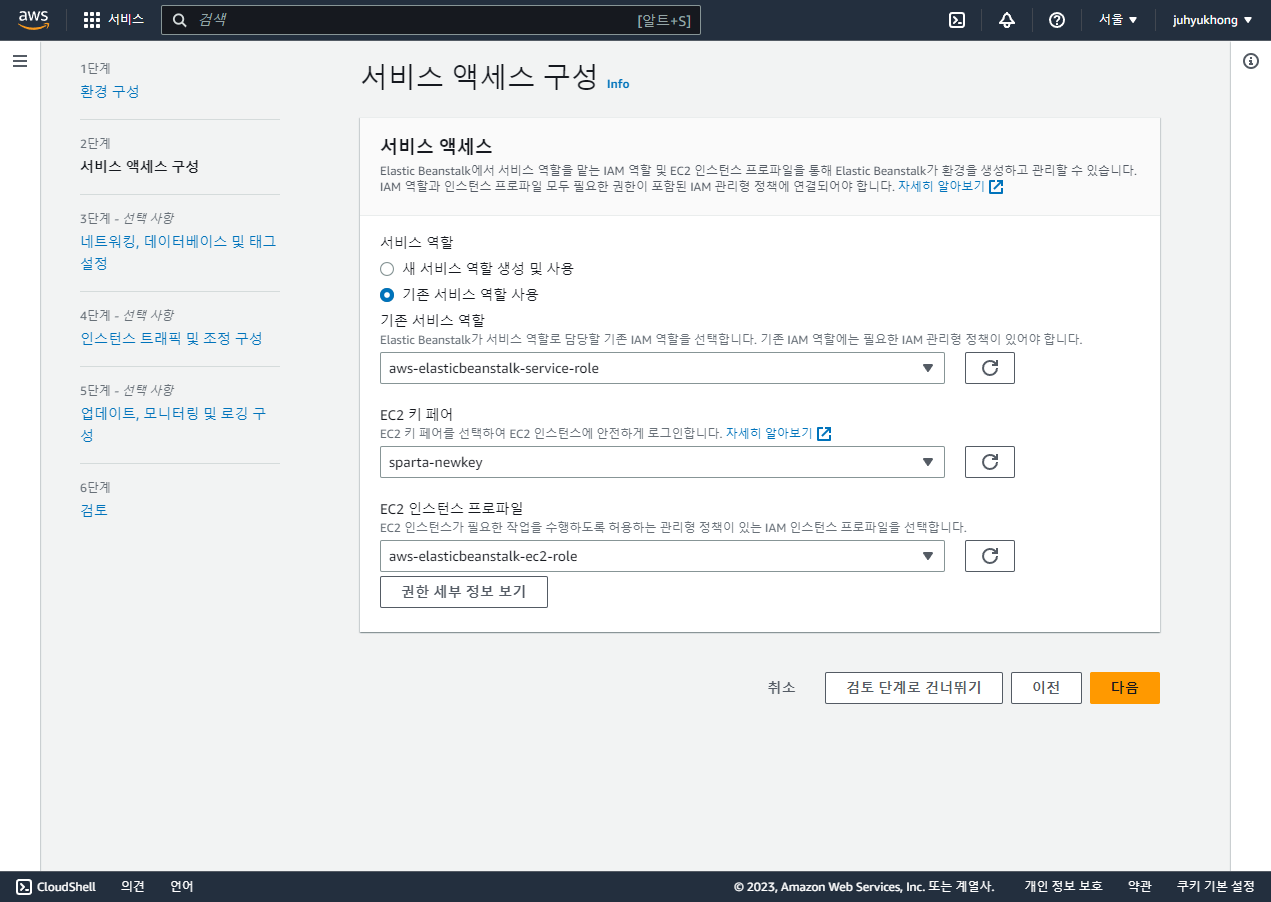 서비스 접근을 위한 설정이다. 만들어두었던 EC2 키페어와 인스턴스 프로파일을 사용했다. 다음으로 넘어가면,