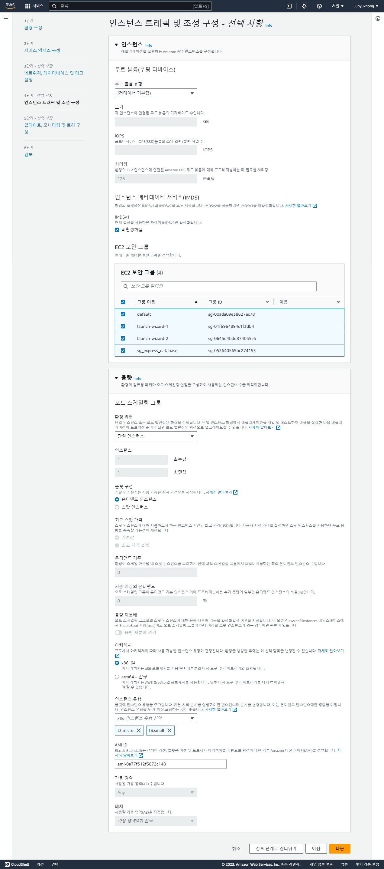 4단계에서는 만들어뒀던 보안그룹만 선택했다. 용량은 건드릴 이유가 없고... 다른 걸 건드렸다가 프리티어를 벗어나게 될지 모르니.