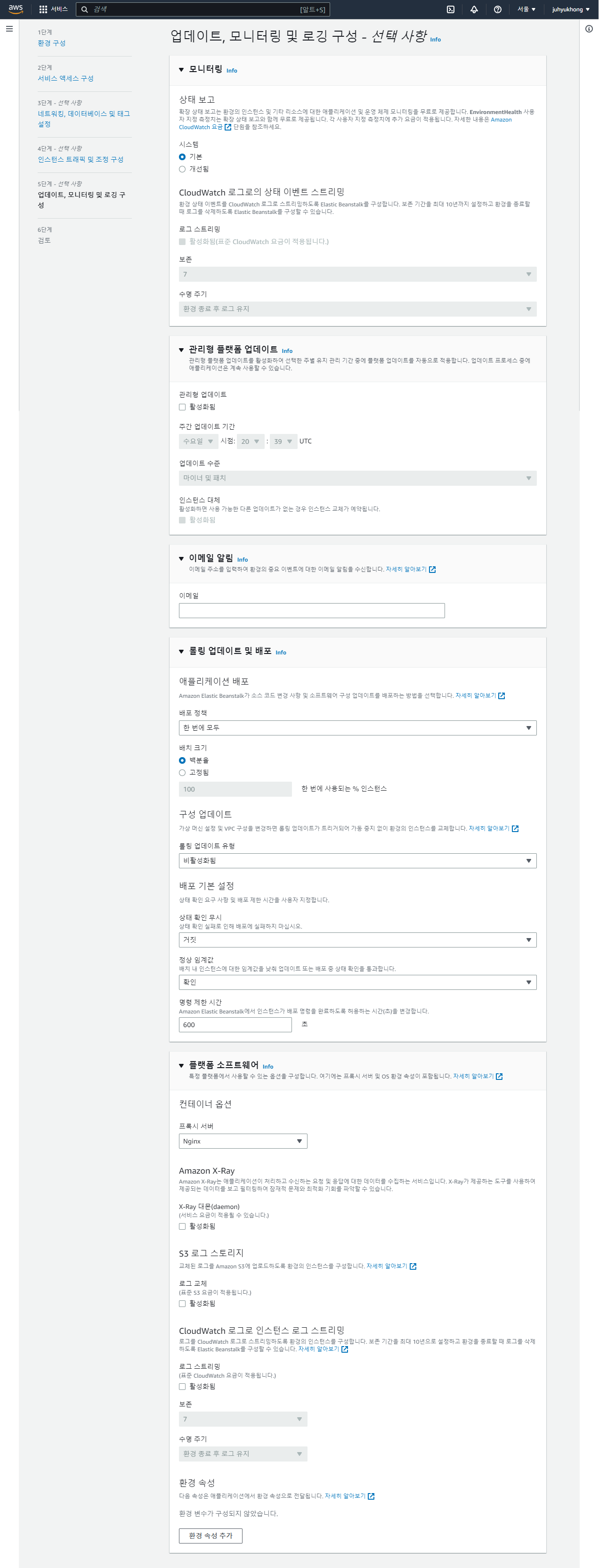 모니터링 상태보고는 시스템 기본으로, 관리형 플랫폼 업데이트는 비활성화, 이메일 알림에 이메일 입력, 프록시 서버는 Nginx로 나뒀고 다른 것 건드리지 않았다.