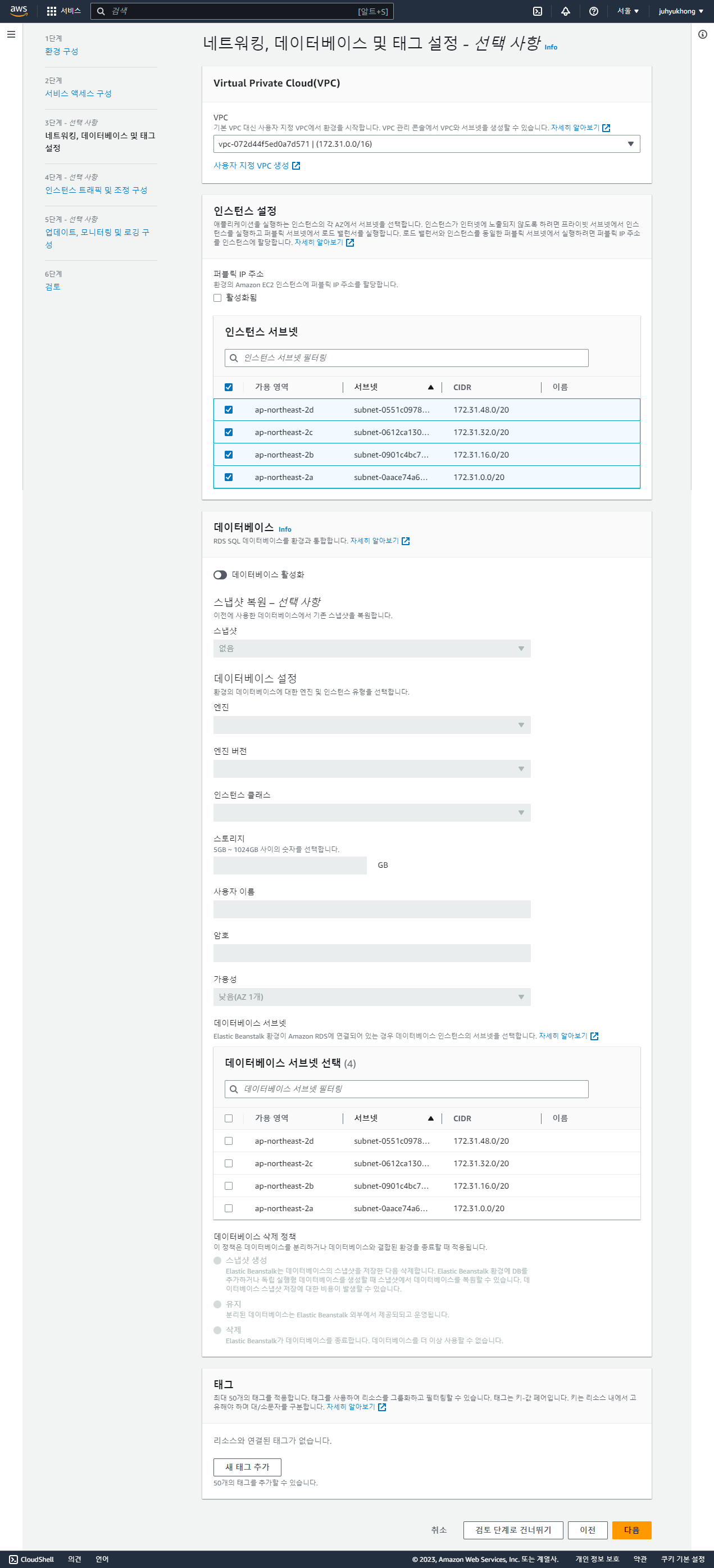 그리고 RDS도 활성화 되어 있긴 한데, 데이터베이스 통합은 그냥 건너 뛰었다.