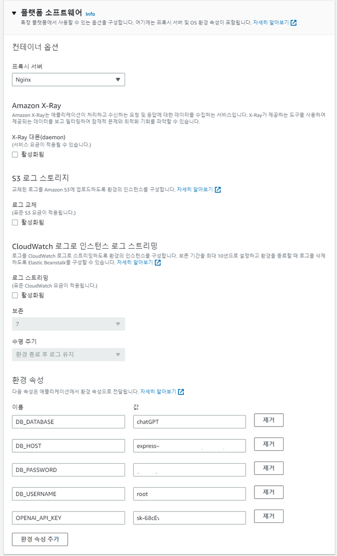 AWS EB 콘솔 > 환경 > 구성 > 업데이트, 모니터링 및 로깅 > 편집 > 플랫폼 소프트웨어 > 환경속성